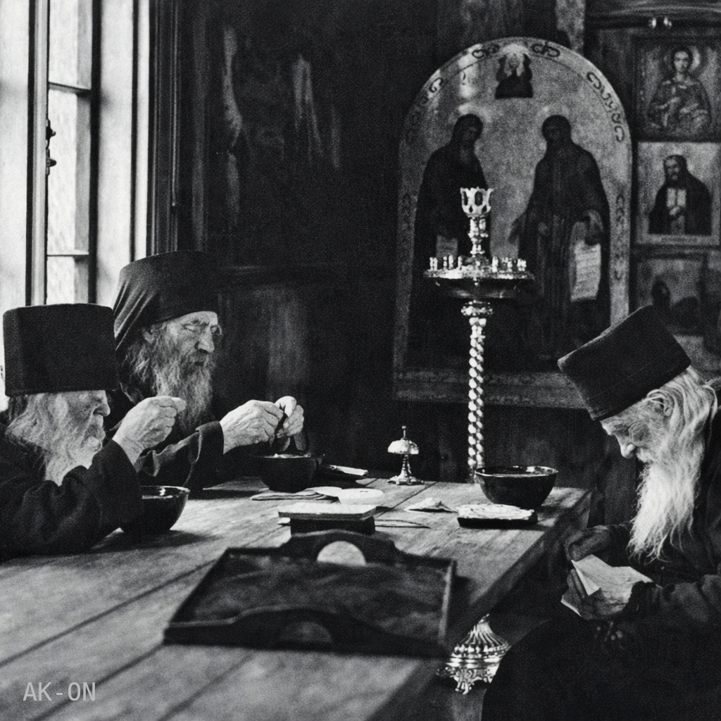 Isät Timofei, Simforian ja Pamfa vanhan kirkkosalin ruokapäydässä. (Kuva © Valamon luostarin kokoelmat, kuvaa paranneltu tekoälyn avulla)